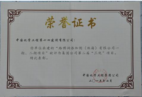 近日,我公司“路博潤添加劑(珠海)有限公司一期、二期項(xiàng)目”喜獲中國化學(xué)工程集團(tuán)公司第二屆“三優(yōu)”項(xiàng)目獎(jiǎng)。