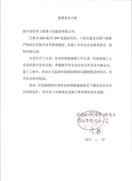 巴斯夫500噸/年包裝線項(xiàng)目施工工作已順利結(jié)束,交工資料基本完成,項(xiàng)目結(jié)算已報(bào)業(yè)主,目前正在審核階段。12月28日,我公司項(xiàng)目部收到巴斯夫項(xiàng)目南京實(shí)華工程項(xiàng)目管理咨詢有限公司贊譽(yù),著重稱贊了我公司嚴(yán)格的安全管理及安全施工要求,順利保證了本項(xiàng)目安全有序地進(jìn)行,做到了安全施工零傷害的優(yōu)異成績。
