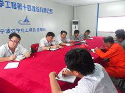 動員大會結(jié)束后,公司黨委書記李大國率國外工程公司經(jīng)理袁曉暉、黨支部書記喻漢祥召集項(xiàng)目部管理人員對大會精神進(jìn)行了貫徹落實(shí),對“百日會戰(zhàn)”期間的工作作重要部署。李書記要求全體參戰(zhàn)人員,要認(rèn)真落實(shí)會議精神,在確保安全和質(zhì)量的基礎(chǔ)上提高施工進(jìn)度,更好地為業(yè)主和總包公司服務(wù),干好順酐項(xiàng)目,讓業(yè)主和總承包方滿意,為公司贏得信譽(yù)、爭創(chuàng)品牌。